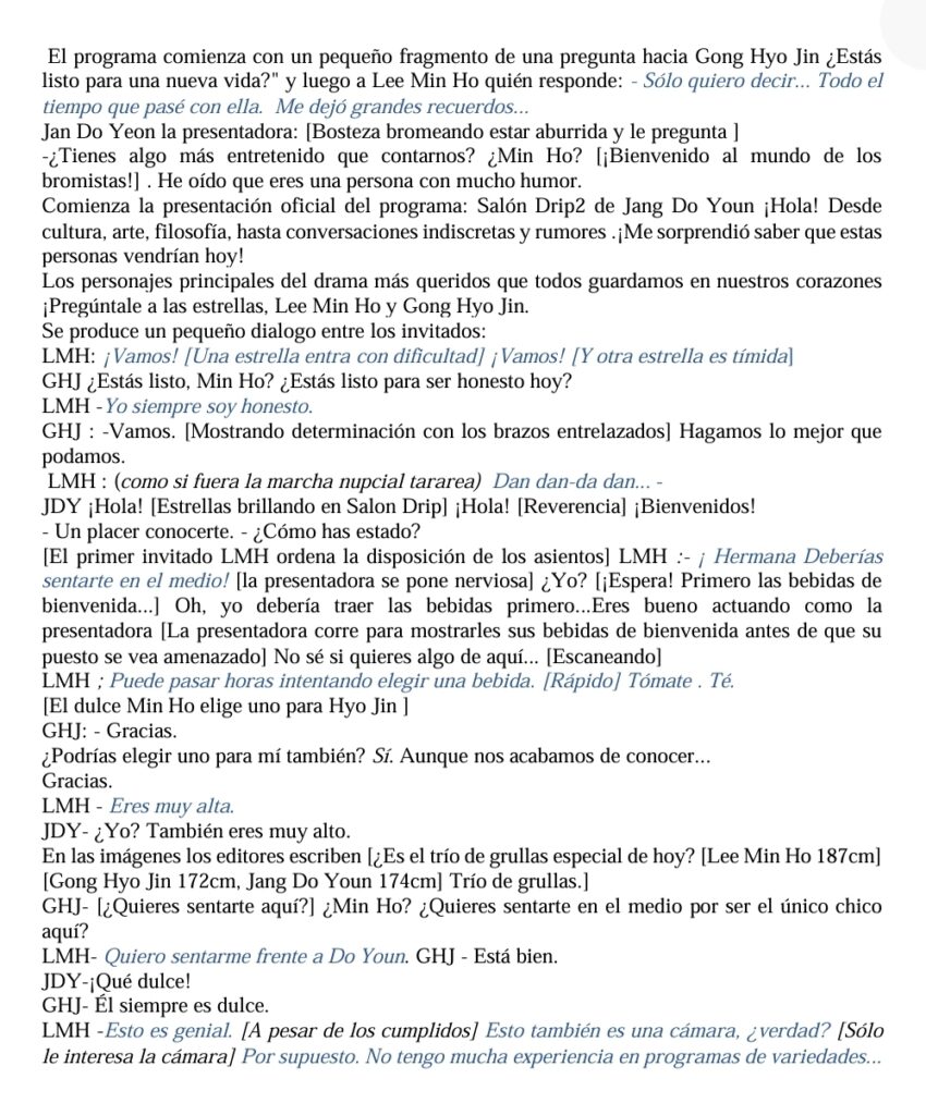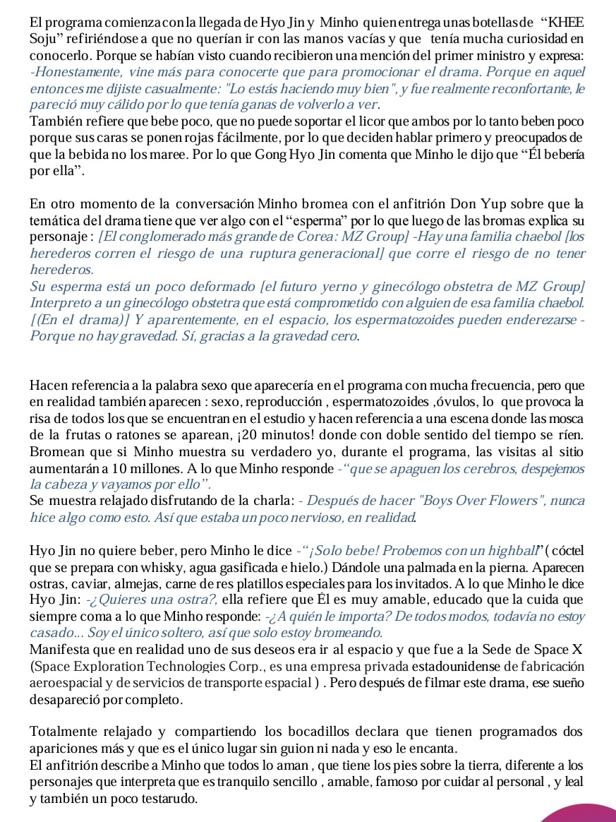 El programa 짠한형 신동엽 (Shin Dongup tipo salado) es presentado por Shin Don Yup y Jung Ho Chul, con el formato de que ambos entablan conversaciones con sus invitados mientras toman unas copas. Este episodio fue grabado días previos al estreno de TvN “When The Stars Gossip” con la concurrencia de Lee Min-Ho y Gong Hyo-Jin.