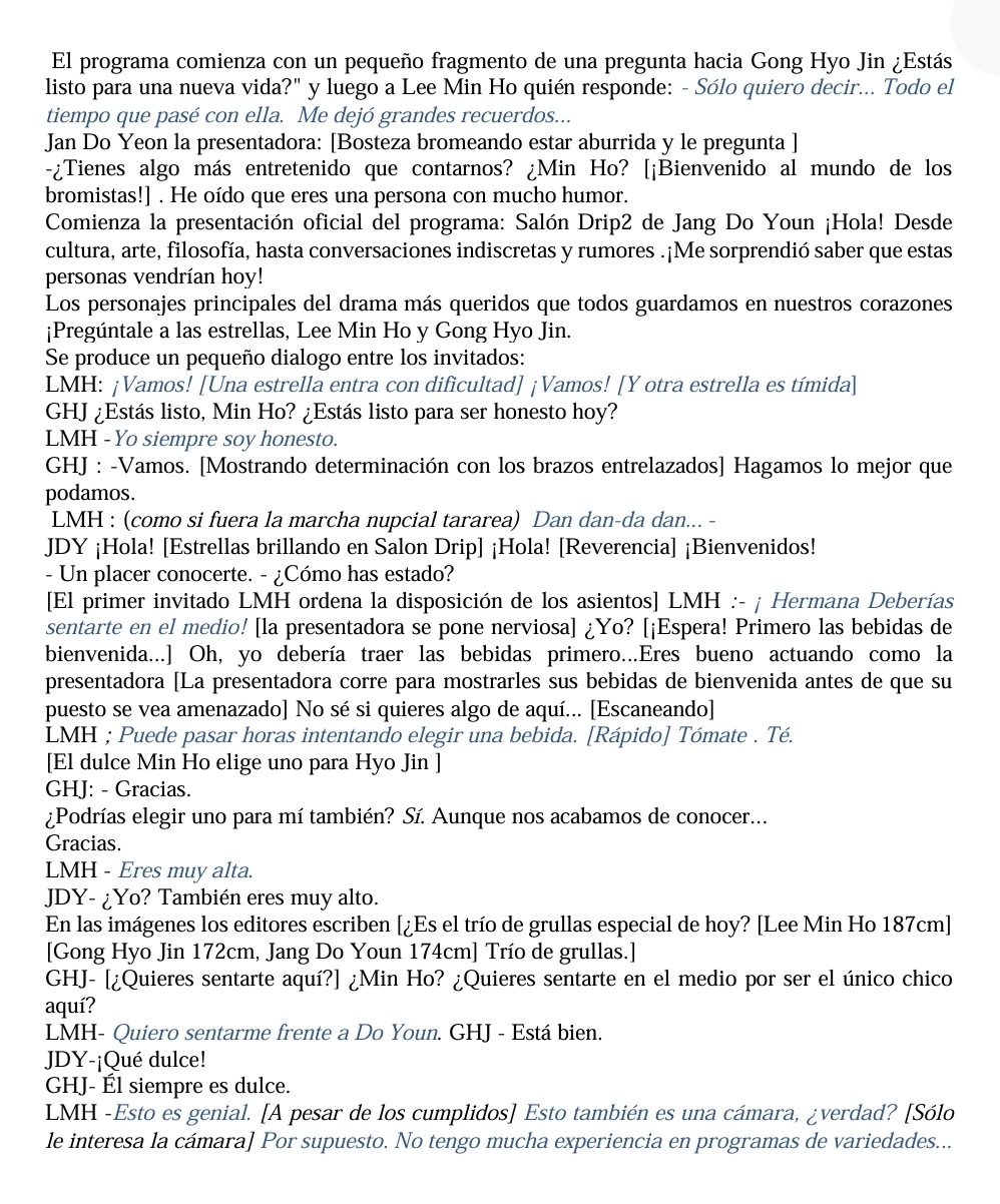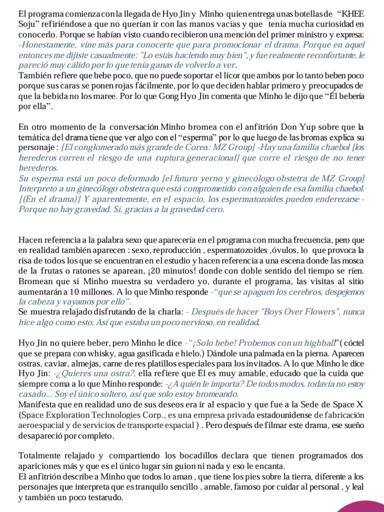 Otro programa elegido para concurrir fue 짠한형 신동엽 (Shin Dongup tipo salado) presentado por Shin Don Yup y Jung Ho Chul, con el formato de que ambos entablan conversaciones con sus invitados mientras toman unas copas. Este episodio fue grabado días previos al estreno de TvN “When The Stars Gossip” con la concurrencia de Lee Min-Ho y Gong Hyo-Jin. Particularmente este programa fue muy especial poder escuchar a Minho sobre temas varios como sus pensamientos , sus opiniones y que en varias oportunidades nos provocó una sonrisa . Relajado, disfrutando de unas buenas bebidas y su risa, memorable, una faceta que no vemos habitualmente en Lee Min Ho.