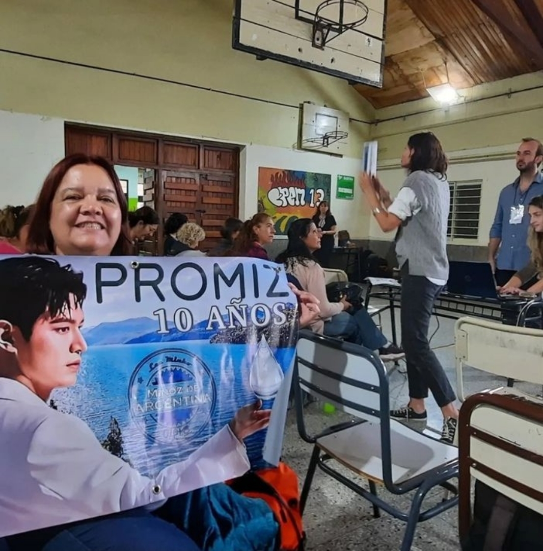 Cuando decimos que ser Minoz de Argentina es todo un sentimiento, lo decimos con toda firmeza demostrada en el amor y la pasión con que hacemos las cosas, en esta oportunidad estuvimos muy bien representadas por nuestra querida Minoz María Laura Briceno como docente comprometida en su labor junto a su esposo Gabriel Rabbia (quién la acompaña en esta fiebre minhomaníaca), llevó adelante la bandera de nuestro Fans Club para concretar esta hermosa y comprometida cruzada sobre el Agua y así festejar de una manera especial los 10 años de Promiz.