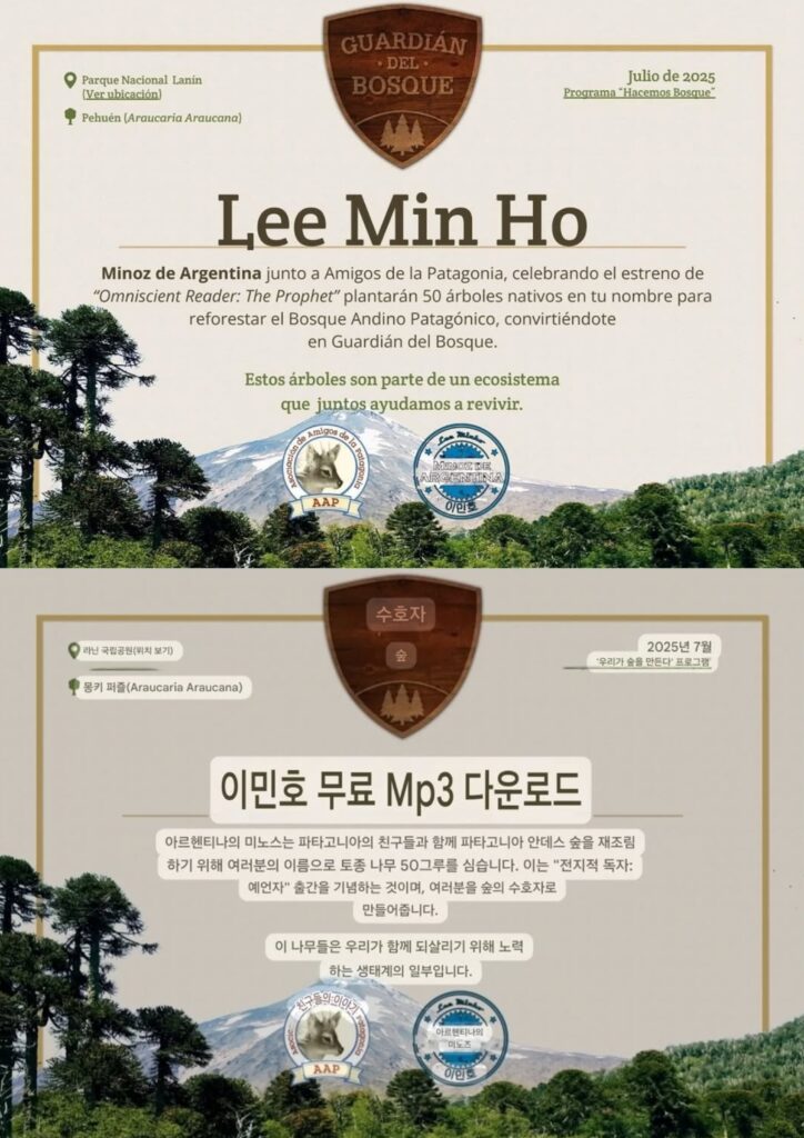 축하합니다!( Minoz de Argentina dona árboles en la patagonia con motivo del estreno de The Prophet. Lee Min Ho, que el éxito de Omniscient Reader: The Prophet crezca tan robusto y fuerte como estos árboles en la patagonia y que tus logros sigan floreciendo como las flores en la naturaleza en su máximo esplendor. Felicidades y buenos augurios!!!)