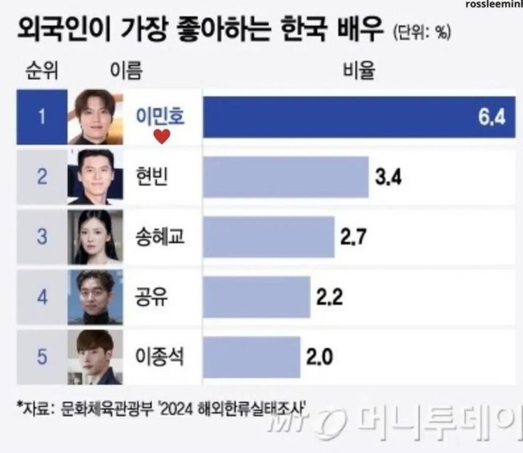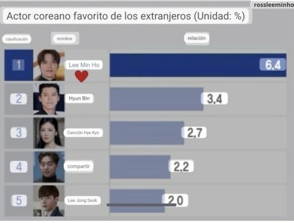 Nuestro admirado Lee Min Ho es considerado el «Rey del Hallyu» porque ocupó el primer puesto entre los actores coreanos favoritos en el extranjero durante 11 años consecutivos. Según la encuesta realizada en el 2024 (a partir de 2023), sobre la «Ola Coreana en el Extranjero» publicada por el Ministerio De Cultura, Deportes y Turismo y la Fundación de Corea por el Intercambio Cultural Internacional el día 2 de Abril, Lee Min Ho ocupó el 1° lugar de en la categoría de actor coreano. Por continente: ocupo el 1° lugar en Asia/Pacífico (7,7%), América (5,4%), Europa(4,8%), Medio Oriente(8,2%) y África (6,2%).