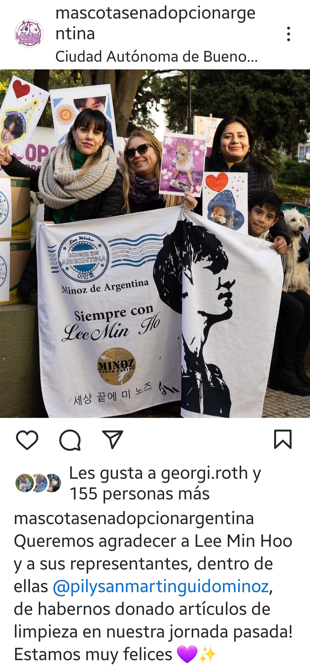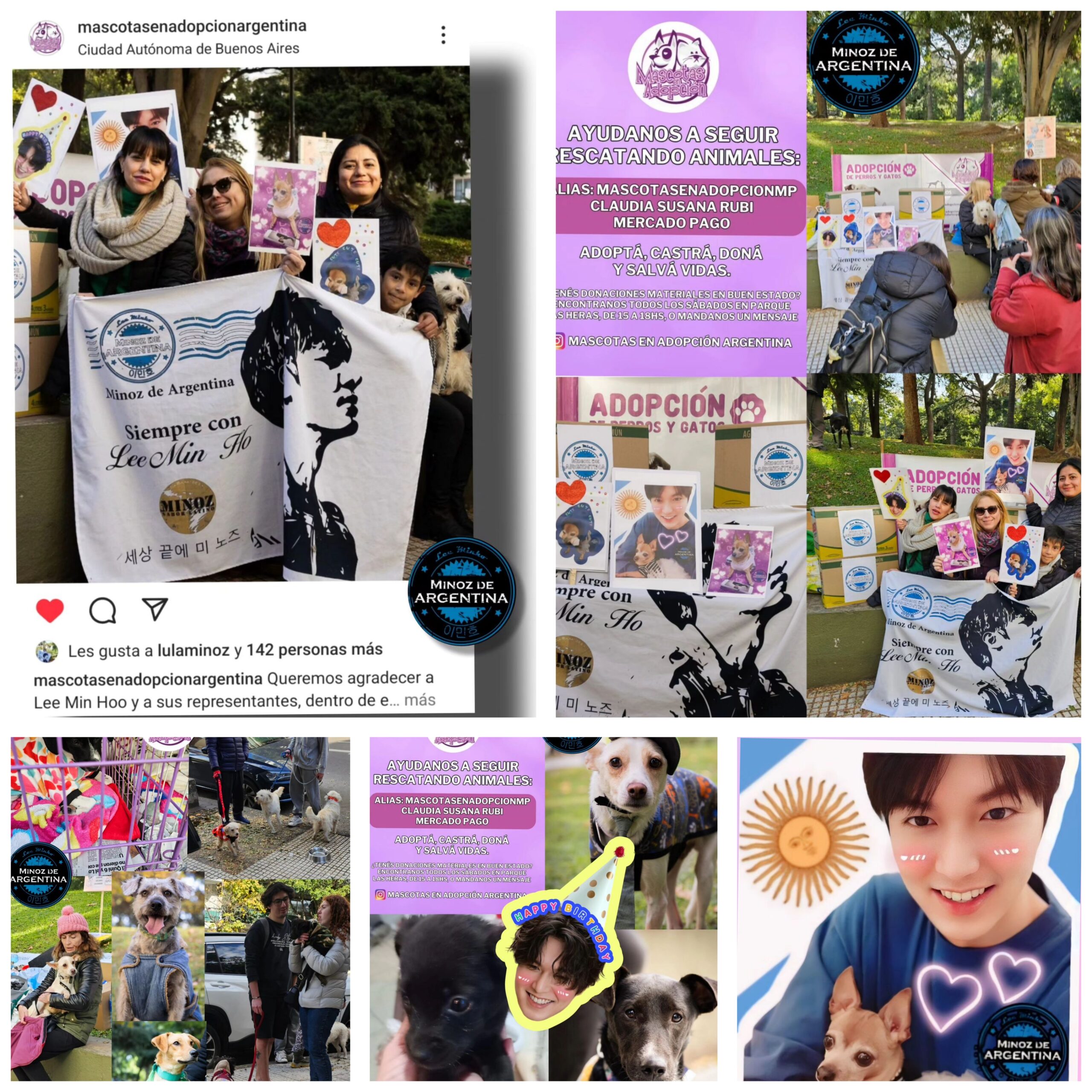 Esta vez hicimos esta actividad solidaria en este mes con motivo del cumpleaños de Min Ho. Se decidió ayudar con una donación de productos de higiene a la ONG Mascotas en Adopción. Ellos rescatan perros y gatos, los cuales los curan , cuidan y cuando ya están restablecidos, los sábados los llevan al Parque Las Heras que es un parque público ubicado en el barrio de Palermo en sus lindes con Barrio Norte y Recoleta. El fin es que puedan ser adoptados por familias responsables y que puedan brindarle mucho amor y un hogar a las mascotas.